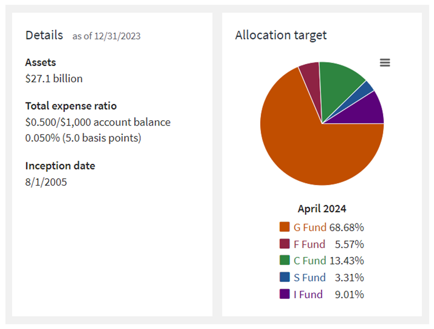 - The lifecycle funds are often chosen as a “set it and forget” strategy. This type of thinking can become problematic as retirement nears. As you can see below, we have included the allocation for the L Income fund, which each lifecycle fund eventually ends based on the target date chosen. The L Income fund becomes very G fund heavy and may leave your retirement nest egg falling short of inflation in the long-term.